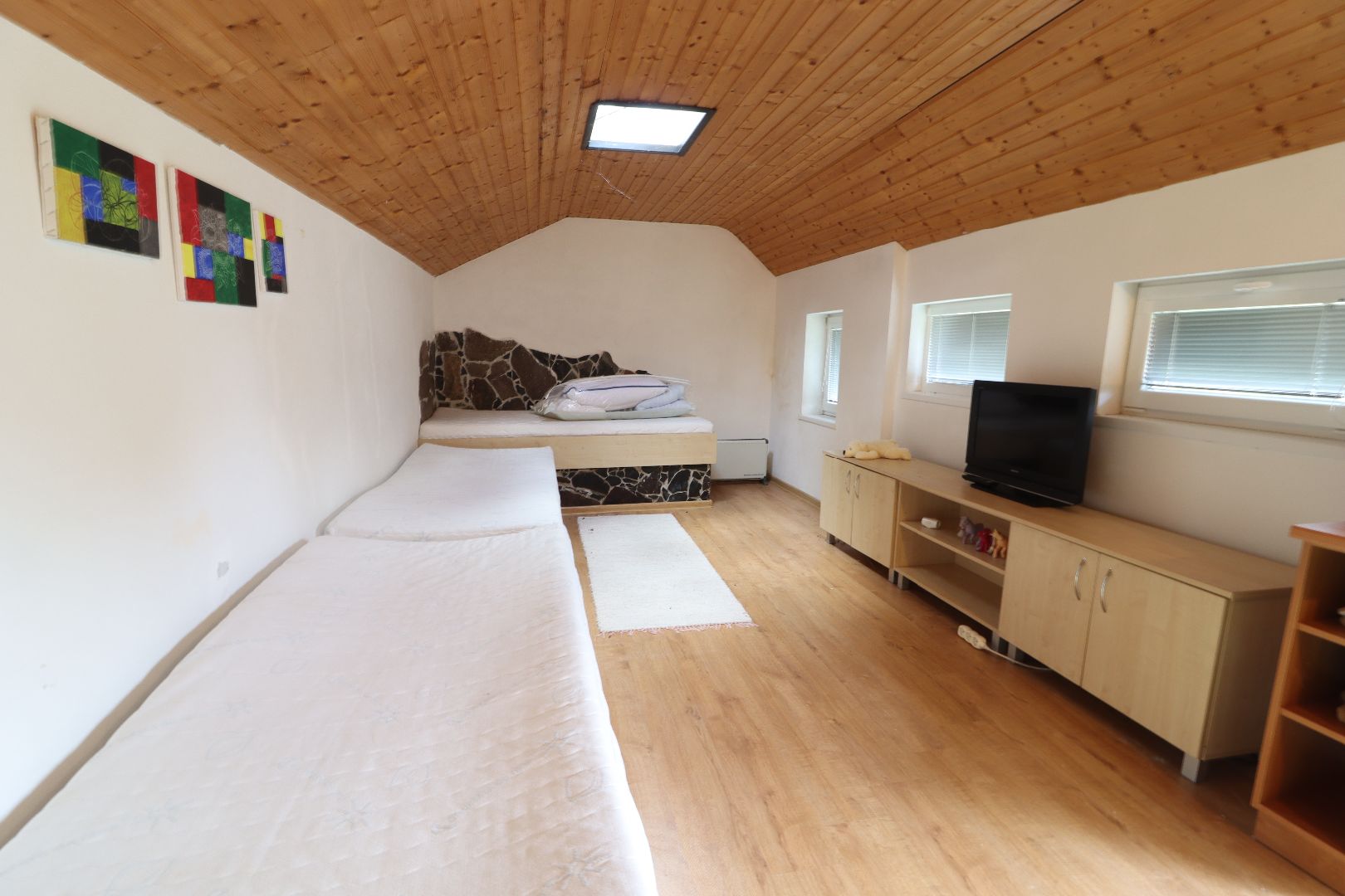 Ponúkame na predaj rodinný dom, ktorý sa nachádza v obci Bátovce (15 km od Levíc, 28 km od B.Štiavnice) v tichej časti obce. Dom je situovaný na konci ulice, bol postavený v roku 1985. Spodná časť domu je z kameňa, ostatná časť z tehly. Dom prešiel kompletnou rekonštrukciou, je zateplený a stojí na rovinatom pozemku o celkovej výmere 1.571 m2. Dispozícia rodinného domu: prízemie: obývacia izba prepojená s kuchyňou, samostatná spálňa, kúpeľňa (sprchový kút) s WC. 1. NP: izba s lodžiou, 2x menšie izby. Dom je podpivničený, je napojený na všetky inžinierske siete (okrem plynu), kúrenie – radiátory elektrické, voda je ohrievaná bojlerom, okná – drevené eurookná, plávajúca podlaha. Na pozemku sa nachádza letný dom, kde sa vyspia min. 3 osoby, taktiež altánok, záhradný domček, menší bazén, rybník, atď.. Pri dome je garáž. V obci sa nachádzajú potraviny, základná škola s materskou škôlkou, pošta. Neďaleko sa nachádzajú štiavnické jazerá, Levický hrad, a pod.. Dom je v OV, bez ťarchy, voľný predajom. *Odporúčam obhliadku.*